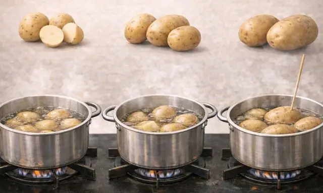 じゃがいもを大きさ別に鍋で茹でて仕上がりを確認している調理イメージ