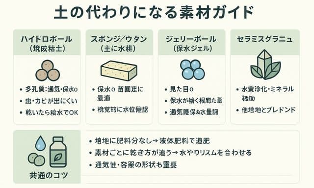 なお、どの素材にも共通するのは、「肥料分が含まれていない」という点です。土のように微生物による自然な分解・供給が行われないため、液体肥料などで定期的に栄養を補う必要があります。また、使用する素材によっては水分の蒸発が早かったり、逆に滞留しやすかったりするため、素材ごとの特性を理解し、それに応じた水やりのリズムを掴むことも重要です。