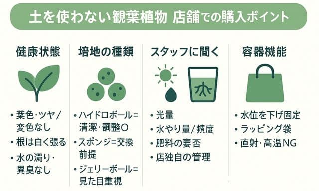 A. 葉色・ツヤ・変色なし、根が白く張っている、溶け根なし。培地の種類(ハイドロボール/スポンジ/セラミス)と管理法を店員に確認。