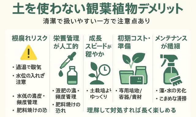 土を使わない観葉植物は清潔で扱いやすく、虫が寄り付きにくいなど多くの利点がありますが、その反面、いくつか注意すべきデメリットも存在します。こうした点を事前に知っておくことで、トラブルを未然に防ぎ、より快適に植物と付き合っていくことができます。