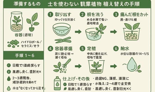 観葉植物を土なしで育てる方法として、水耕栽培やハイドロカルチャーが注目されていますが、植え替えの際には独自の工程と注意点があるため、丁寧な手順を知っておくことが重要です。特に、根に直接水分や光が当たるこれらの方法では、通常の鉢植えとは異なる配慮が求められます。間違った方法で行うと、根腐れや生育不良を招くこともあるため、順を追って正しく行うことが求められます。