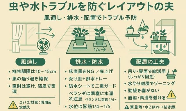 他にも、水やりのタイミングや導線を考えたレイアウトも意識しておくと日々の管理がしやすくなります。水が必要な植物と乾燥気味を好む植物を分けて配置したり、手の届きにくい位置には水やり頻度の少ない種類を置くといった工夫も有効です。こうすることで、ムダな水やりを防ぎ、結果として湿度過多による病害の発生リスクも下げることができます。