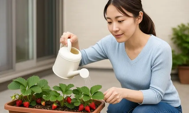 このように、水やりは「たっぷりあげればよい」という単純なものではなく、株の状態、土の乾き具合、環境条件などを見極めながら行う繊細な作業です。毎日の観察とタイミングを大切にしながら、適切な水管理を心がけていきましょう。それが、健康ないちごを育て、甘くて美味しい実を収穫するための第一歩です。