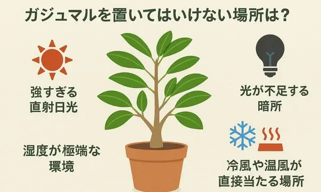 A. 強い直射日光、暗すぎる場所、冷風や温風が当たる場所、湿度が極端な環境は避けるべきです。Q. 玄関にガジュマルを置くとどんな効果がありますか?