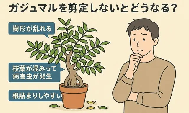 A. 枝葉が乱れて見た目が悪くなり、風通しが悪化して病害虫が発生しやすくなります。Q. ガジュマルの花言葉は何ですか?