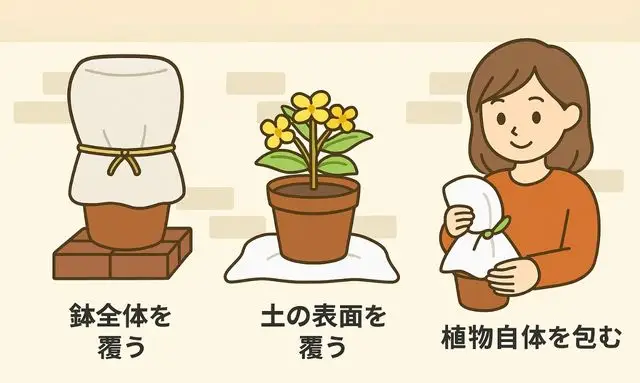 不織布を使う際の代表的な方法は、「鉢全体を覆う」「土の表面を覆う」「植物自体を包む」の3つです。鉢全体を覆う場合は、鉢の外側から不織布をぐるりと巻き、麻ひもやゴムでしっかり固定します。これによって、冷たい外気が鉢の内部に直接伝わるのを防ぎ、根の温度を一定に保つことができます。さらに、鉢底からの冷えを軽減するために、レンガや木製の台に鉢を乗せるとより効果的です。