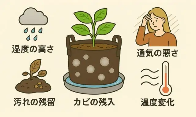 不織布プランターがカビる主な環境要因には、「湿度の高さ」「通気の悪さ」「汚れの残留」「温度変化」の4つがあります。不織布は通気性が良いという特徴を持つ一方で、水分を吸いやすい性質も備えているため、湿った状態が長く続くとカビが繁殖しやすくなります。特に、屋外で使用していて雨ざらしになっている場合や、風通しの悪い室内で管理している場合は、湿度がこもりやすく、カビの発生源になりやすいのです。
