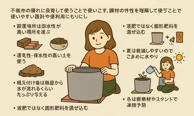 つまり、不織布プランターを直置きで使う際のポイントは、**「底を浮かせる」「通気を保つ」「定期的に確認する」**の3つです。これらを守ることで、プランターの寿命を延ばし、植物が根腐れや病気を起こすリスクを減らすことができます。少しの工夫で、不織布プランターの通気性・排水性という特長を最大限に活かし、より快適で清潔なガーデニング環境を保つことができるでしょう。
