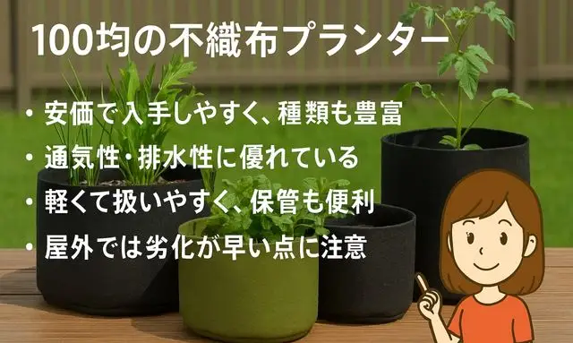 A. 通気性・排水性が高く、軽くて扱いやすく、根が健康に育ちやすい点が大きなメリットです。また、折りたたんで収納できる利便性もあります。Q3. 不織布プランターのデメリットはありますか?