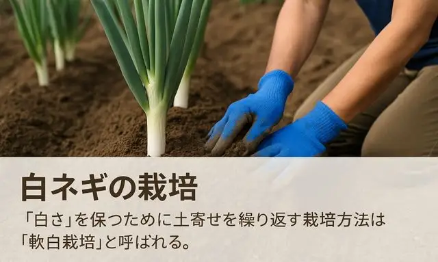 白ネギの栽培には、他の野菜にはない独特の手間と工夫が必要です。その最大の特徴が「軟白(なんぱく)栽培」と呼ばれる方法です。軟白栽培とは、ネギの白い部分を長く、やわらかく育てるために、成長に合わせて根元に何度も土をかけていく技法のことを指します。光を遮ることで葉緑素の生成を抑え、白くて甘みのある部分を育てることができます。逆に日光に当たりすぎると緑化してしまい、硬く、風味も強くなりすぎるため、白ネギの「白さ」を保つためには土寄せが欠かせません。