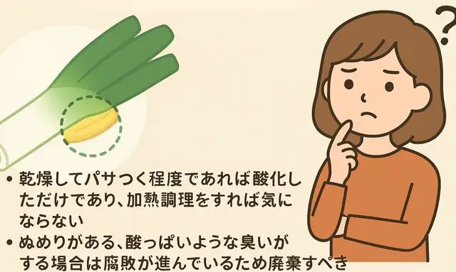 A. 軽い変色なら問題ありませんが、ぬめりや異臭がある場合は腐敗しているので食べないでください。Q14. ネギの保存方法で長持ちするコツはありますか?