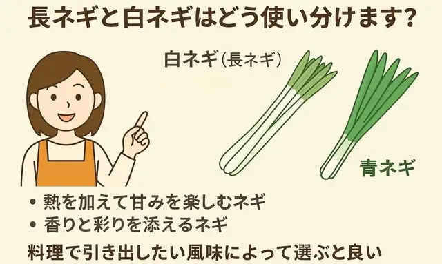 白ネギは加熱すると甘みが増し、青ネギは香りが強く生食に向く