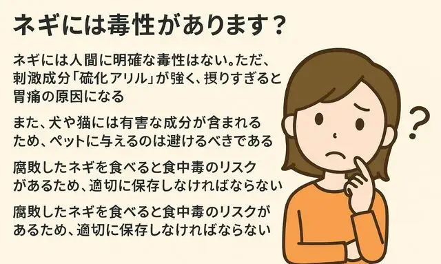A7. 人間にとっては毒性はありませんが、犬や猫などのペットにとっては有害です。少量でも中毒を起こす恐れがあるため注意しましょう。Q8. 長ネギの青い部分は生で食べられますか?