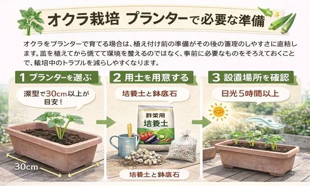 オクラをプランターで育てる場合は、植え付け前の準備がその後の管理のしやすさに直結します。苗を植えてから慌てて環境を整えるのではなく、事前に必要なものをそろえておくことで、栽培中のトラブルを減らしやすくなります。