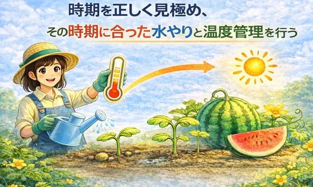 このように、スイカを種から育てる際は、「時期の判断」と「管理方法」が常にセットになっています。時期に合った管理ができていなければ、発芽や初期生育は安定しません。逆に、時期を正しく見極め、その時期に合った水やりや温度管理を行うことで、失敗のリスクを大きく減らすことができます。