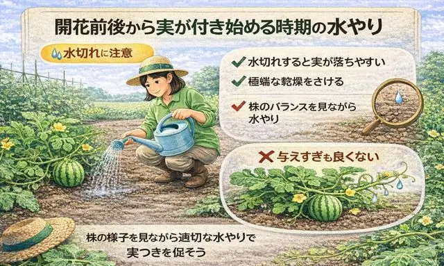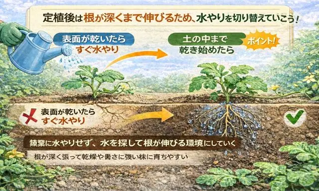 この時期の水やりは、単に水を与える作業ではなく、その後のつるの伸びや実付きにつながる土台づくりの意味を持っています。根をしっかり張らせる意識を持って管理することで、スイカ栽培全体が安定しやすくなります。