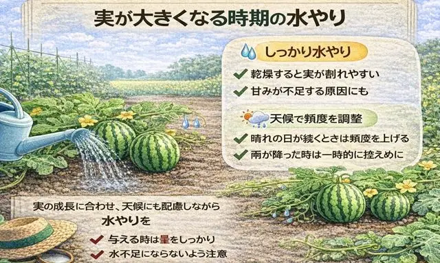 実が付き、肥大が始まると、水管理はスイカ栽培の中でも特に重要な段階に入ります。この時期の水やりは、単に実を大きくするための作業ではなく、食味や甘さ、果肉の締まりといった品質全体に直結する管理になります。判断を誤ると、見た目は問題がなくても、味や食感に大きな差が出やすくなります。