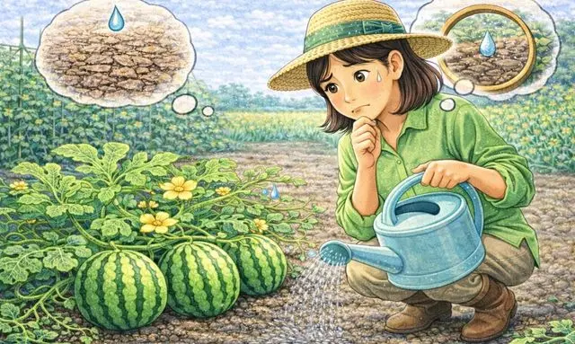 スイカの水やりで最も難しいのは、「今、水を与えるべきかどうか」の判断です。カレンダーどおりに水を与えたり、毎日決まった時間に水やりをしたりすると、一見管理しているように見えますが、実際の生育状況と合っていないことも少なくありません。スイカの水やりでは、回数や日数ではなく、土と株の状態を見ることが重要になります。
