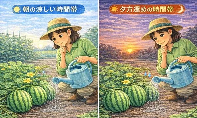 スイカの水やりでは、量や頻度だけでなく、いつ水を与えるかという時間帯も重要な判断ポイントになります。同じ量の水を与えたとしても、時間帯によって株への影響は大きく変わります。水やりの時間を意識することで、根への負担を減らし、生育を安定させやすくなります。