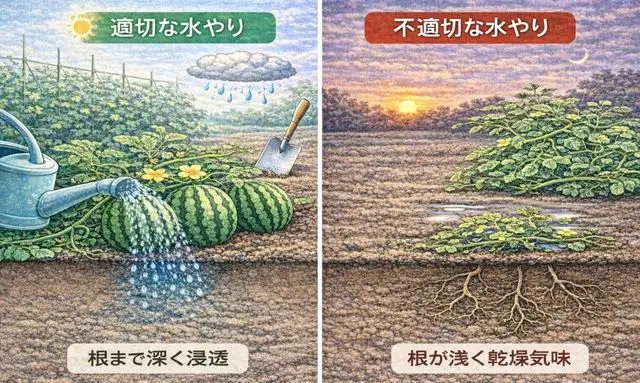 このように、スイカの水やりでは「朝を基本に、状況に応じて調整する」という考え方が大切です。時間帯を意識するだけでも、水やりによる失敗は大きく減らすことができます。
