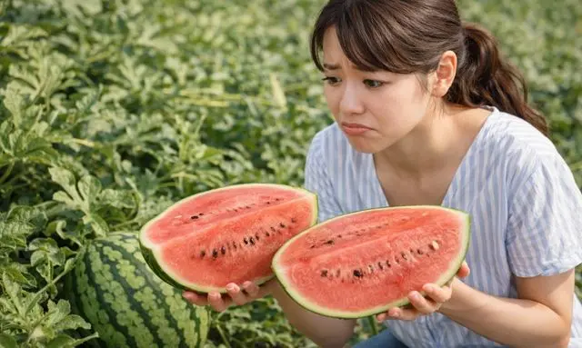 早採りしたスイカで最も多い失敗が、甘み不足です。果肉は赤く色づいていても、糖の蓄積が十分でないため、味が薄く、水っぽく感じられることがあります。これは、スイカが果実肥大の後半に糖を蓄える性質を持っているためで、見た目だけで判断すると起こりやすい失敗です。