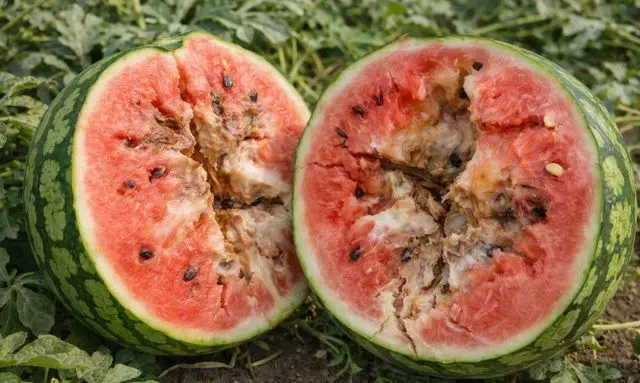 収穫が遅れたスイカでまず起こりやすいのが、果肉の食感低下です。完熟を過ぎると、果肉の細胞がゆるみ、シャリ感が弱くなります。見た目は問題なくても、切ったときに水っぽく感じたり、締まりのない食感になったりすることがあります。