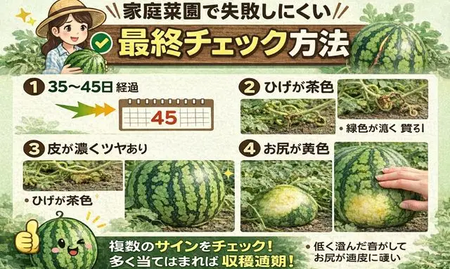 スイカの収穫時期を見分けるための判断サインをまとめた家庭菜園の写真