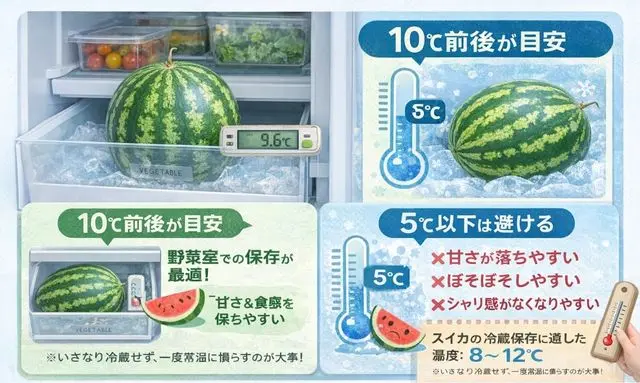 畑で育ったスイカは高温に慣れているため、急激に低温環境へ移すと、果肉の水分バランスが崩れやすくなります。