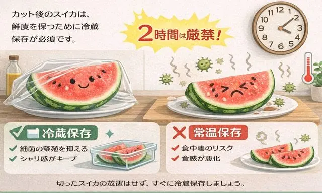 スイカは収穫時点で味が完成している果物だからこそ、**保存方法の失敗がそのまま「まずくなった原因」**になりやすい特徴があります。