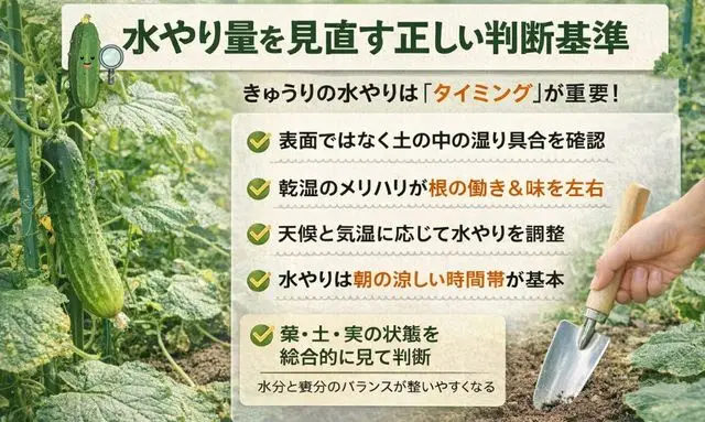 きゅうりの味を改善するためには、「水を減らす・増やす」といった単純な調整ではなく、水やり量を判断する基準を持つことが重要です。多くの場合、きゅうりが水っぽくなる原因は、水の量そのものよりも、「必要ないタイミングで水を与えてしまっていること」にあります。