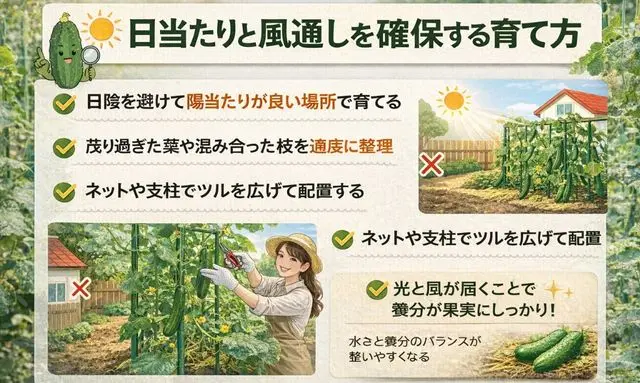 きゅうりの味を安定させるためには、水や肥料だけでなく、日当たりと風通しの確保が欠かせません。日照不足や空気の滞りは、きゅうりの生育にじわじわと影響し、結果として味が薄くなったり、水っぽく感じられたりする原因になります。