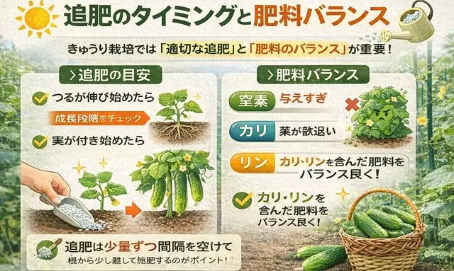 きゅうりの味を改善するうえで重要なのが、追肥のタイミングと肥料バランスです。肥料は多ければよいものではなく、必要な時期に、必要な量を、適切な成分で与えることが、味を安定させるための基本になります。