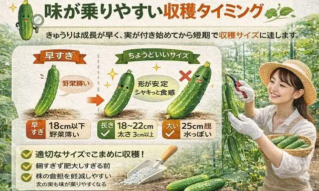 きゅうりの味を濃く保つためには、見た目の大きさだけで判断せず、収穫サイズとタイミングを意識して管理することが重要です。適切な時期に収穫することで、水っぽさを抑え、バランスの取れた味のきゅうりになりやすくなります。