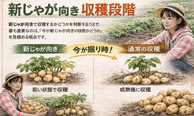 新じゃがとして収穫するかどうかを判断するうえで最も重要なのは、「今が新じゃが向きの段階かどうか」を見極める視点です。新じゃがは、通常の収穫と同じ基準で判断すると分かりにくくなるため、収穫段階の考え方を切り替える必要があります。