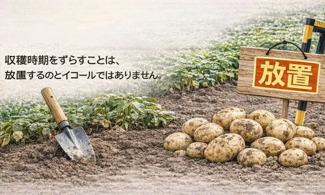次に注意したいのは、「ずらす=放置」にならないことです。収穫を見送る判断をした場合でも、その間にどのような変化を確認するのかを意識しておくことが重要になります。新じゃがの収穫では、段階の違いが重要になるため、ずらした期間中に状態を見直す視点が欠かせません。