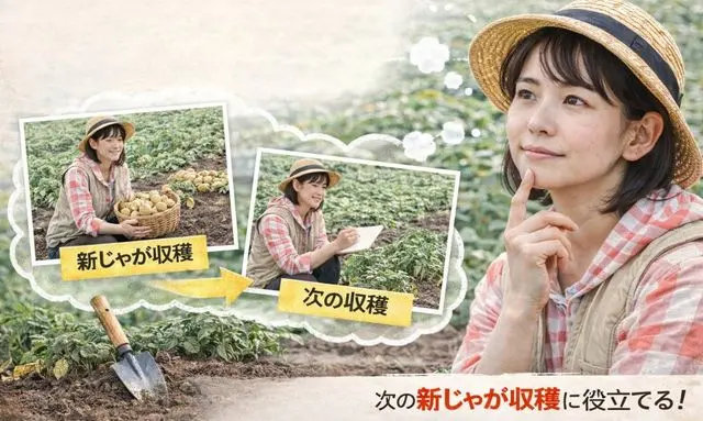 新じゃがとしての収穫経験を重ねていくと、「旬」や「時期」を他人の情報に頼らず、自分の基準で考えられるようになります。これは、新じゃがに限らず、今後のじゃがいも栽培全体を安定させる力になります。経験を積み重ねることで、収穫判断に対する迷いは自然と減っていきます。