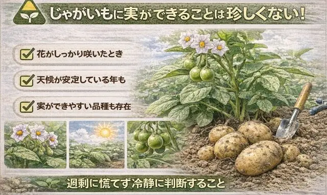 じゃがいもに実ができると、「特別な環境だったのでは」「何か例外的なことが起きたのでは」と感じることがありますが、実ができるケース自体は決して異常ではありません。条件がそろえば、家庭菜園でも自然に起こり得る現象です。この点を理解しておくことで、実を見たときに慌てず対応できるようになります。