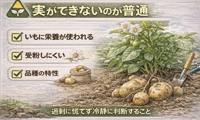 ここで重要なのは、実ができることと地下のいもが順調に育つことは、必ずしも直結していないという点です。実ができたからといって、地下のいもが不作になるとは限らず、逆に実ができなかったからといって生育が失敗しているわけでもありません。実の形成は、あくまで地上部で起こる生育の一側面に過ぎません。