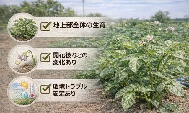 まず確認したいのは、地上部全体の生育が安定しているかどうかです。葉が一定期間元気に展開し、茎もしっかり立っている状態であれば、地下ではいもが形成される準備が進んでいる可能性が高くなります。実が見えなくても、地上部が順調であれば大きな問題はありません。
