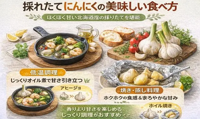 採れたてのにんにくは、水섭量が多く香りがやさしいため、強い刺激を出す調理よりも、じっくり火を通す料理に向いています。北海道産の採れたてにんにくは、辛味が穏やかで甘みが引き出されやすく、この特徴を活かすことで、市販の乾燥にんにくとは違った味わいを楽しむことができます。