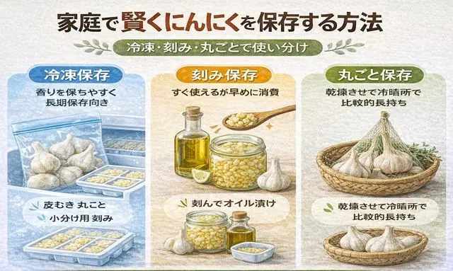 にんにくを家庭で保存する場合、「どの形で保存するか」によって使い勝手と風味の残り方が大きく変わります。北海道産にんにくを無駄なく使い切るためには、すべてを同じ方法で保存するのではなく、使用頻度や調理スタイルに合わせて冷凍・刻み・丸ごと保存を使い分けることが重要です。