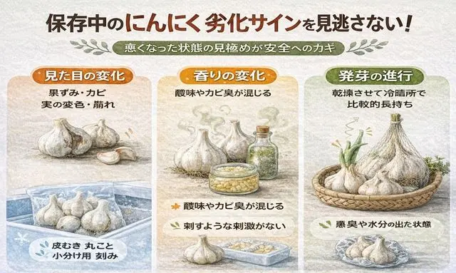 また、にんにくを最後まで美味しく使い切るためには、劣化のサインを見逃さないことも重要です。変色や異臭といった変化に早めに気づくことで、傷む前に使い切る判断ができ、結果として廃棄を減らすことにつながります。これは保存技術だけでなく、日々の観察があってこそ実現できるポイントです。