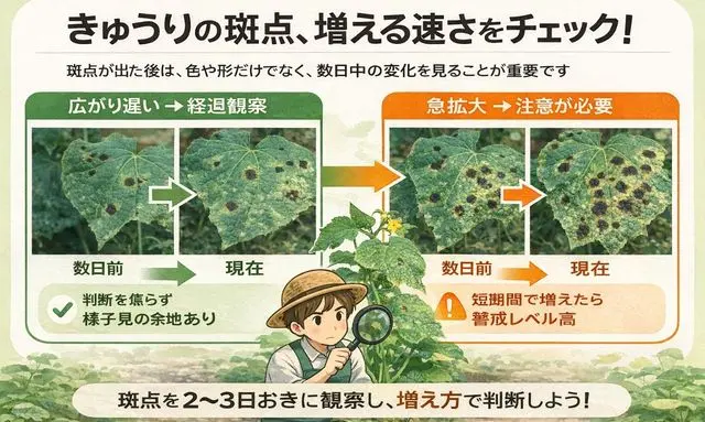 きゅうりの葉に斑点が出たとき、色や形に目が向きがちですが、実はそれ以上に重要なのが、斑点がどれくらいの速さで増えているかという視点です。見た目のインパクトが強い斑点ほど、「出た」という事実だけで判断してしまいがちですが、変化のスピードを意識して観察することで、今の状態が落ち着いているのか、それとも注意が必要なのかを見極めやすくなります。