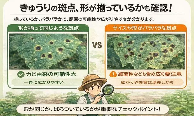 きゅうりの葉に斑点が出たとき、色や数と同じくらい重要なのが、斑点一つひとつの形がどれくらい揃っているかという視点です。見た目に気を取られていると見落としがちですが、形の揃い方には、斑点の性質を読み取るためのヒントが多く含まれています。