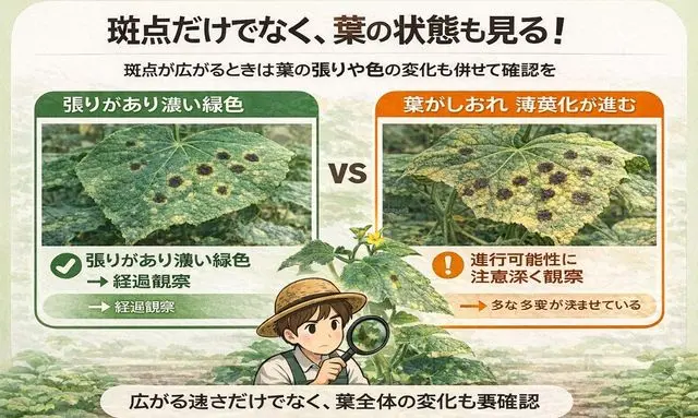 さらに、斑点以外の変化と連動していないかも確認すべきポイントです。斑点が増えているように見えても、葉の張りが保たれており、株全体の勢いが感じられる場合と、斑点の増加と同時にしおれや黄変が進んでいる場合とでは、意味合いが大きく異なります。スピードを見る際は、必ず他の症状と切り離さず、全体の流れの中で捉えることが重要です。