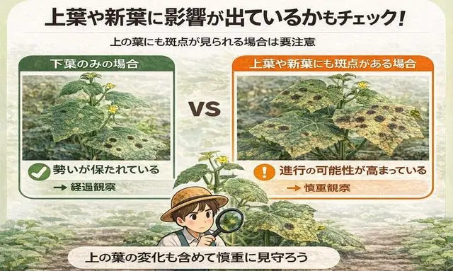 きゅうりの葉に斑点が出たとき、状態を見極めるうえで非常に重要なのが、上葉や新葉に同じような変化が及んでいるかどうかという視点です。下葉や一部の葉に斑点が見られるだけでは判断が難しい場合でも、新しい葉の様子を見ることで、今の状態がどの段階にあるのかを把握しやすくなります。