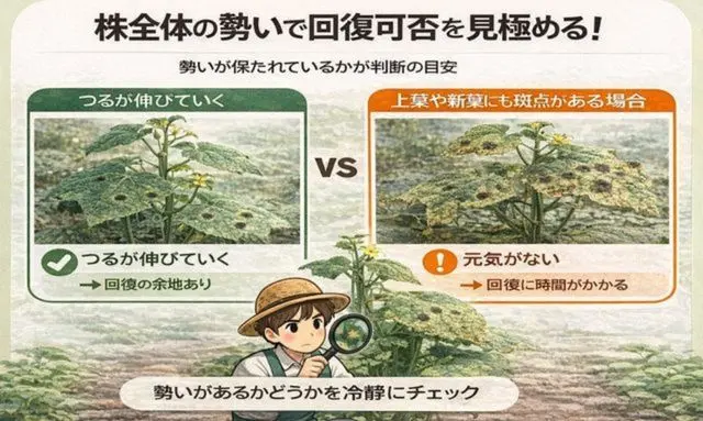 まず注目したいのは、株に動きがあるかどうかです。斑点が出ている葉があっても、つるが少しずつ伸びている、新しい葉が間隔をあけずに展開しているといった変化が見られる場合、株の成長そのものは止まっていない可能性があります。このような動きが確認できる場合は、斑点があっても回復の余地が残っている状態と捉えやすくなります。