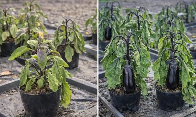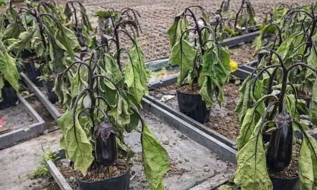 ナスの葉がしおれて下向きになっている様子を写した栽培中の実写写真