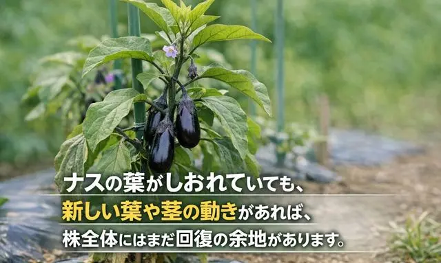 ナスの葉がしおれているとき、最終的な判断で最も重視したいのは、しおれている葉そのものではなく、株全体にどれだけ勢いが残っているかという視点です。部分的なしおれは目に入りやすい一方で、株全体の状態は見落とされがちですが、回復の余地を見極めるうえでは欠かせない判断軸になります。