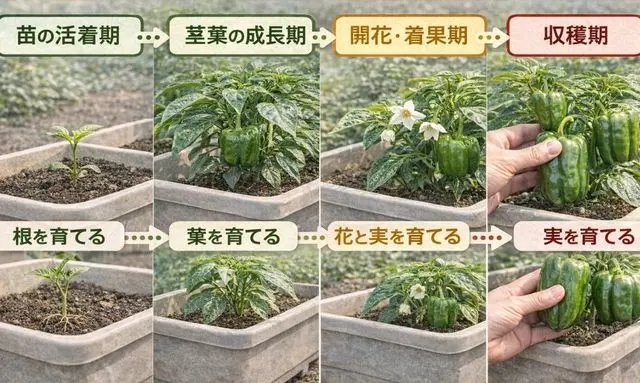 このように、ピーマンは生育サイクルごとに「今、株が何を優先しているか」を意識して管理することが成功のカギとなります。常に実をつけさせようとするのではなく、根・葉・花・実のバランスを段階的に整えていくことで、安定した生育と長い収穫期間を実現しやすくなります。
